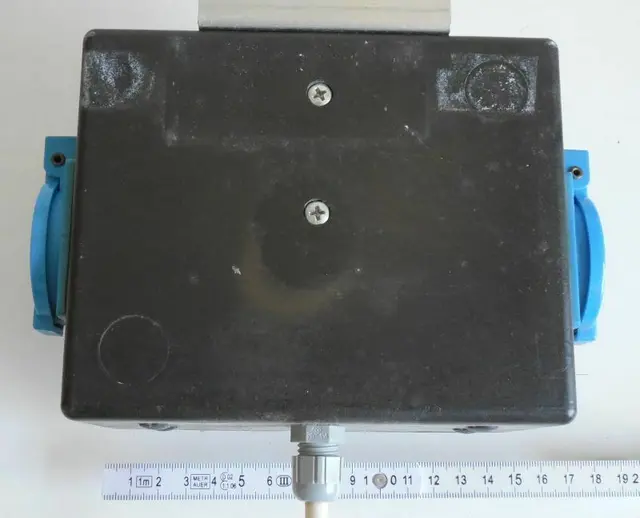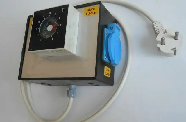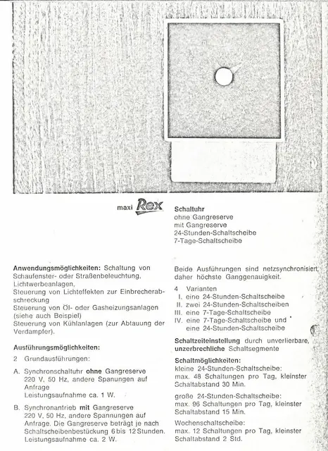 maxi REX-Synchronschaltuhr mit Wochen-Schaltscheibe kleinster Schaltabstand ca.120Min und 24-Stunden-Schaltscheibe kleinster Schaltabstand ca.30Min, jeweils mit Umschaltkontakt 10A 250V, eingebaut in Kunststoffgehäuse ca.150x120x70mm mit seitlichen Schukosteckdosen mit Klappdeckel, Anschlußkabel mit Schukostecker, Anschlußfertig und betriebsbereit.