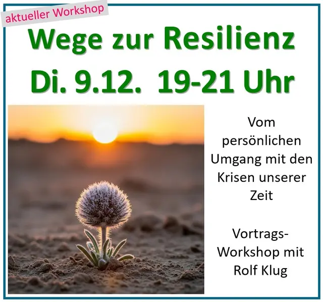 Vortrags-Workshop von Rolf Klug am 09.12.2025, 19-21 Uhr im Offenen Treff "Verbindung der Welten" Nürnberger Str. 161, Erlangen, kostenfrei. - Wie können wir stabil, gesund und glücklich bleiben bzw. werden, angesichts der ständigen Bedrohungen und Krisen. Die Informationsflut mit negativen, erschütternden, unverständlichen Meldungen überwältigt uns und beeinträchtigt unsere Psyche, Gesundheit und Lebensqualität. Anhand klassischer Philosophen und einiger Lehrer unserer Zeit werden Wege beleuchtet, wie wir und unsere Gemeinschaften resilienter werden können. Wir teilen unsere Erfahrungen, Einstellungen und Methoden miteinander. https://verbindungderwelten.de