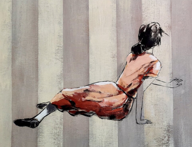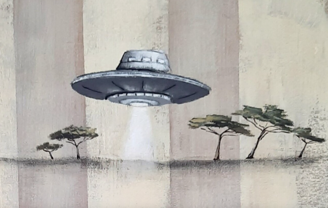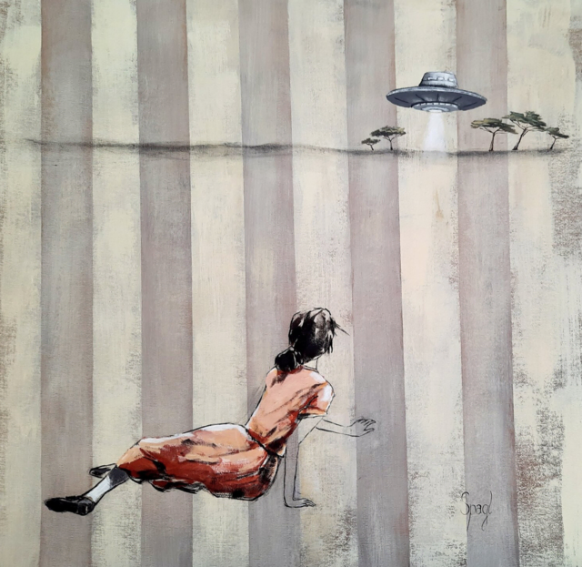 "Dieses Gemälde ist eine Hommage an den berühmten amerikanischen Maler Andrew Wyatt. Anja Spagl stellt seine „Christina“ in einen neuen, surrealen Kontext. Anstatt zum Haus zu blicken, beobachtet sie nun die Ankunft eines UFOs.