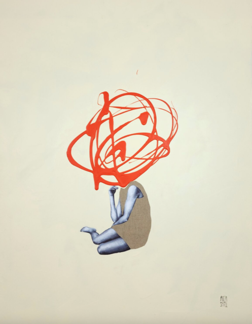 "Eine barfüßige Frau sitzt vor einem schlichten, elfenbeinfarbenen Hintergrund, der schlicht in Schwarzweiß gemalt ist. Ihr Kleid ist eine Collage aus unbearbeiteter Leinwand, ein leiser Hinweis auf Kreativität. Wo ihr Kopf sein sollte, befindet sich ein großer, leuchtend orangefarbener Farbspritzer – wild, chaotisch, lebendig. Es ist, als wäre der Kopf selbst in Gedanken und Gefühle explodiert. Ich sehe es als Symbol dafür, wie chaotisch der Geist sein kann, aber auch dafür, wie viel kreative Energie in diesem Chaos steckt. Der Kontrast zwischen der ruhigen Figur und der Farbexplosion sagt etwas darüber aus, wie wir äußerlich oft still wirken, während innerlich alles in Bewegung ist. Headspace ist ein minimalistisches, psychologisches Werk, eine kleine Reflexion darüber, wie Kreativität und Unordnung oft zwei Seiten derselben Sache sind.