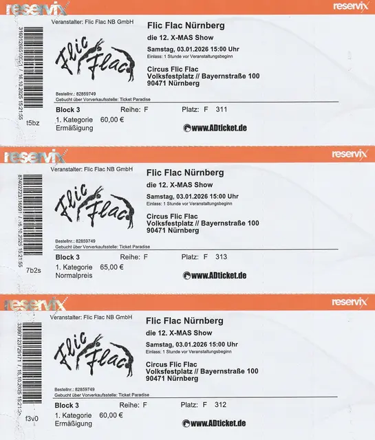 Es sind 2 x vergünstigte Tickets je 60,-€ und 1 x Normalpreis 65,-€