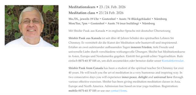 Shishir Pauk aus Kanada, seit mehr als 40 Jahren Meditationsschüler von Sri Chinmoy (1931-2007), gibt an 2 Abenden Tipps zum Meditieren. Gemäß echter Yoga-Tradition kostenlos.